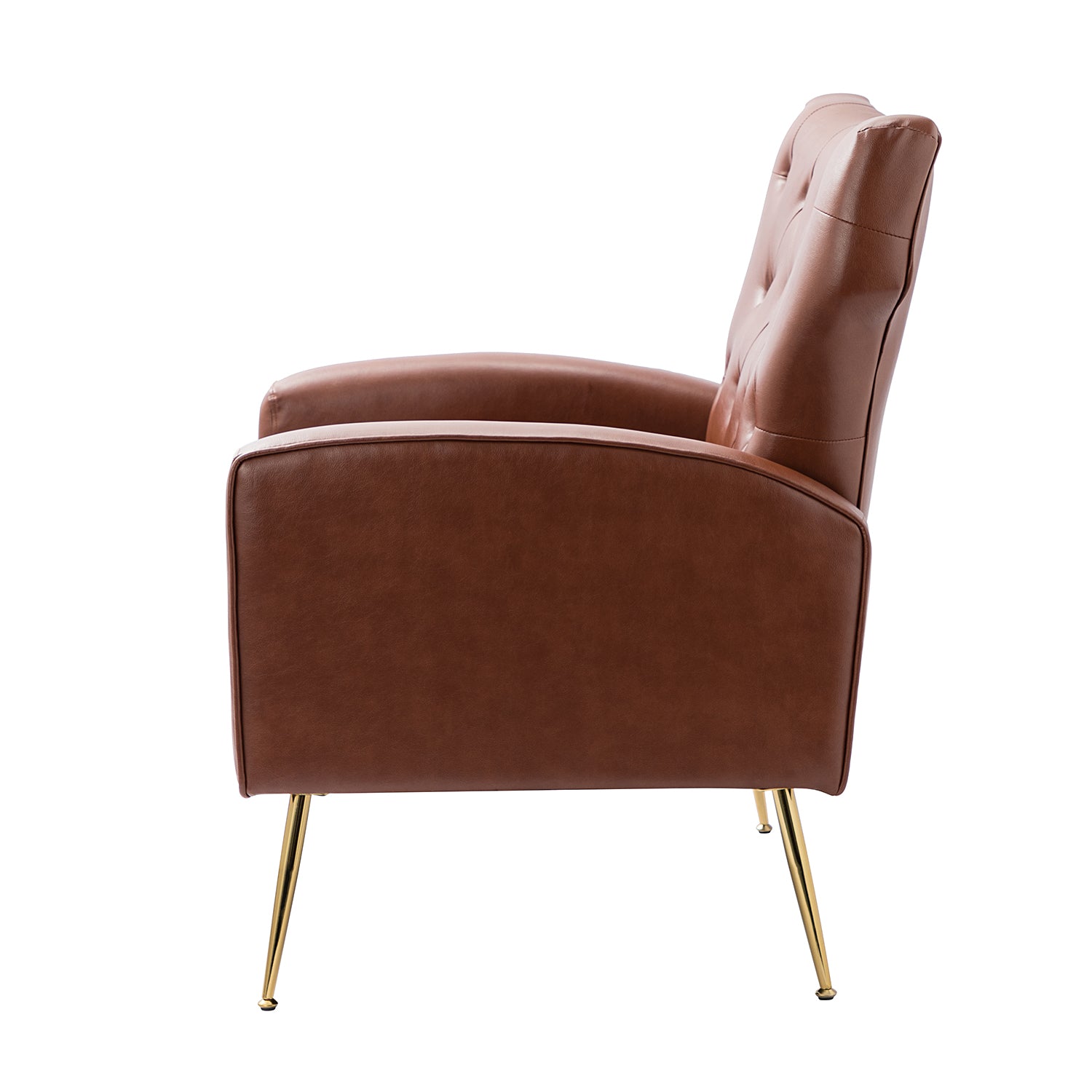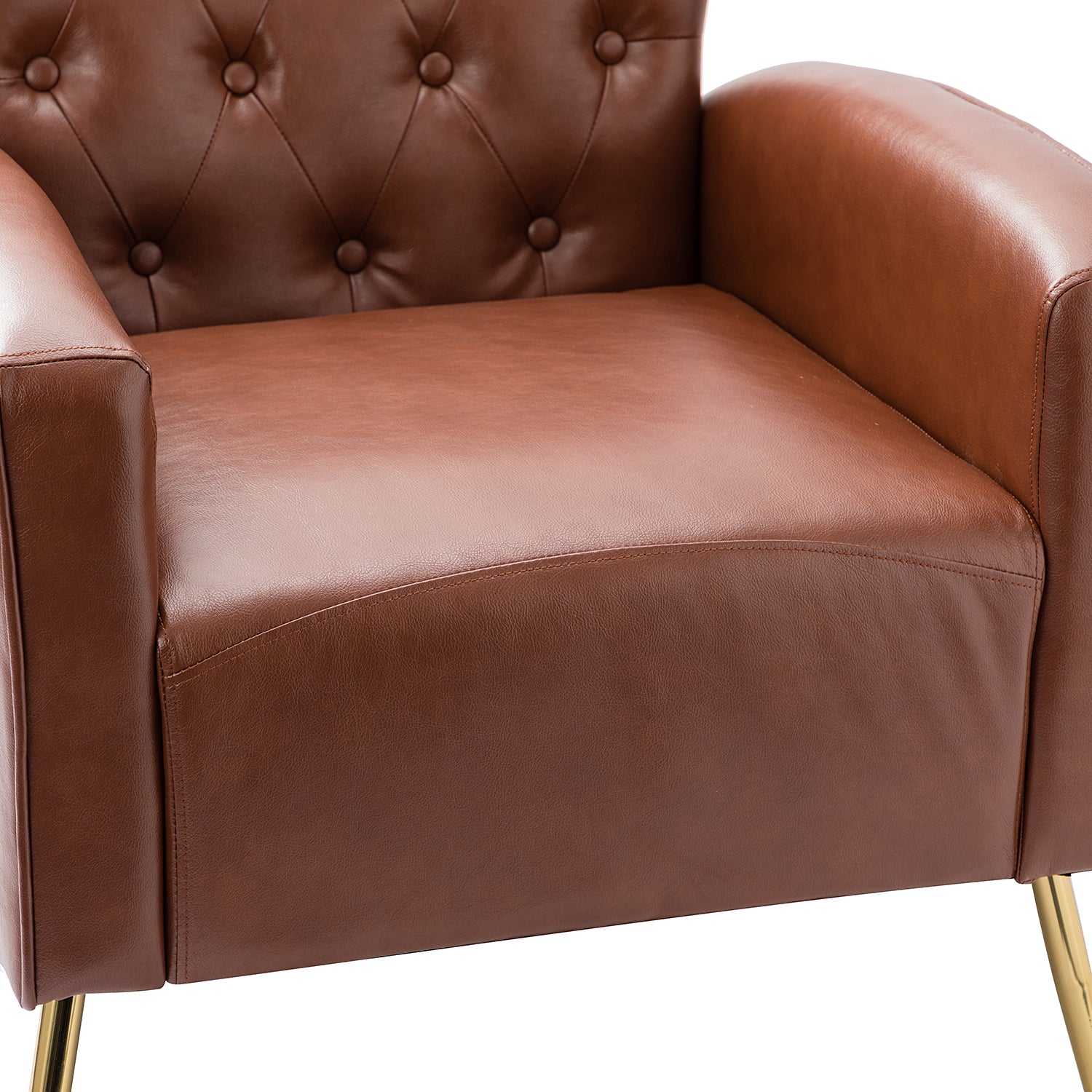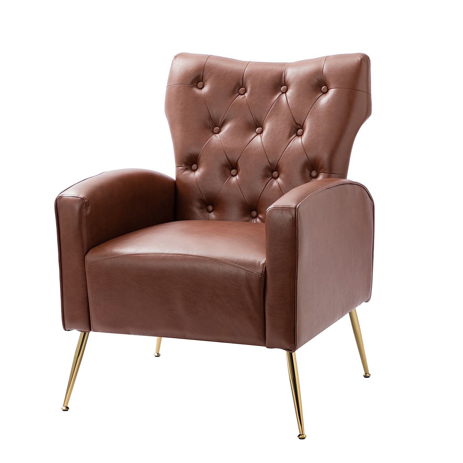 The slender polished golden metal legs bring modern design and add to the timeless fashion of this piece. Plus, this armchair is defined by an iconic silhouette with a dramatic button tufted back and piped edges, while the chair features detail stitching for a tailored touch.