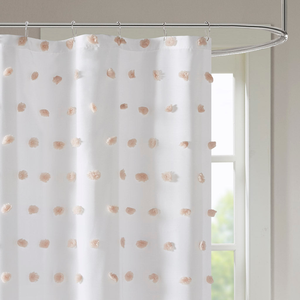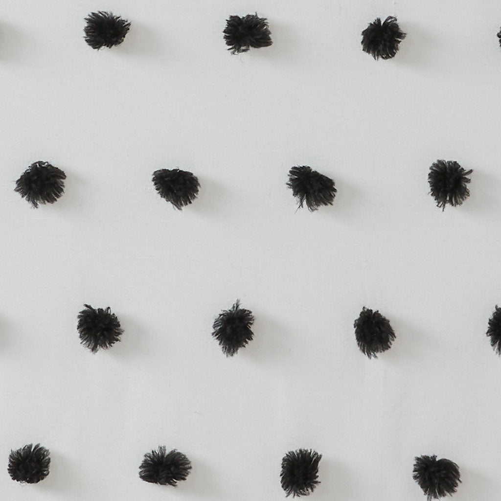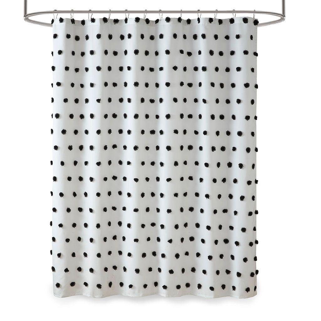 Add a fun update to your space with the Madison Park Sophie shower curtain. The solid white background features rows of soft black fabric pom poms, adding beautiful texture and a stylish update to any bathroom. Machine Washable for easy care; Each shower curtain measure 72"x72" and is finished with 12 button holes at the top making it easy to hang; hooks, rod, and a water repellant liner are not included and will need to be purchased separately.